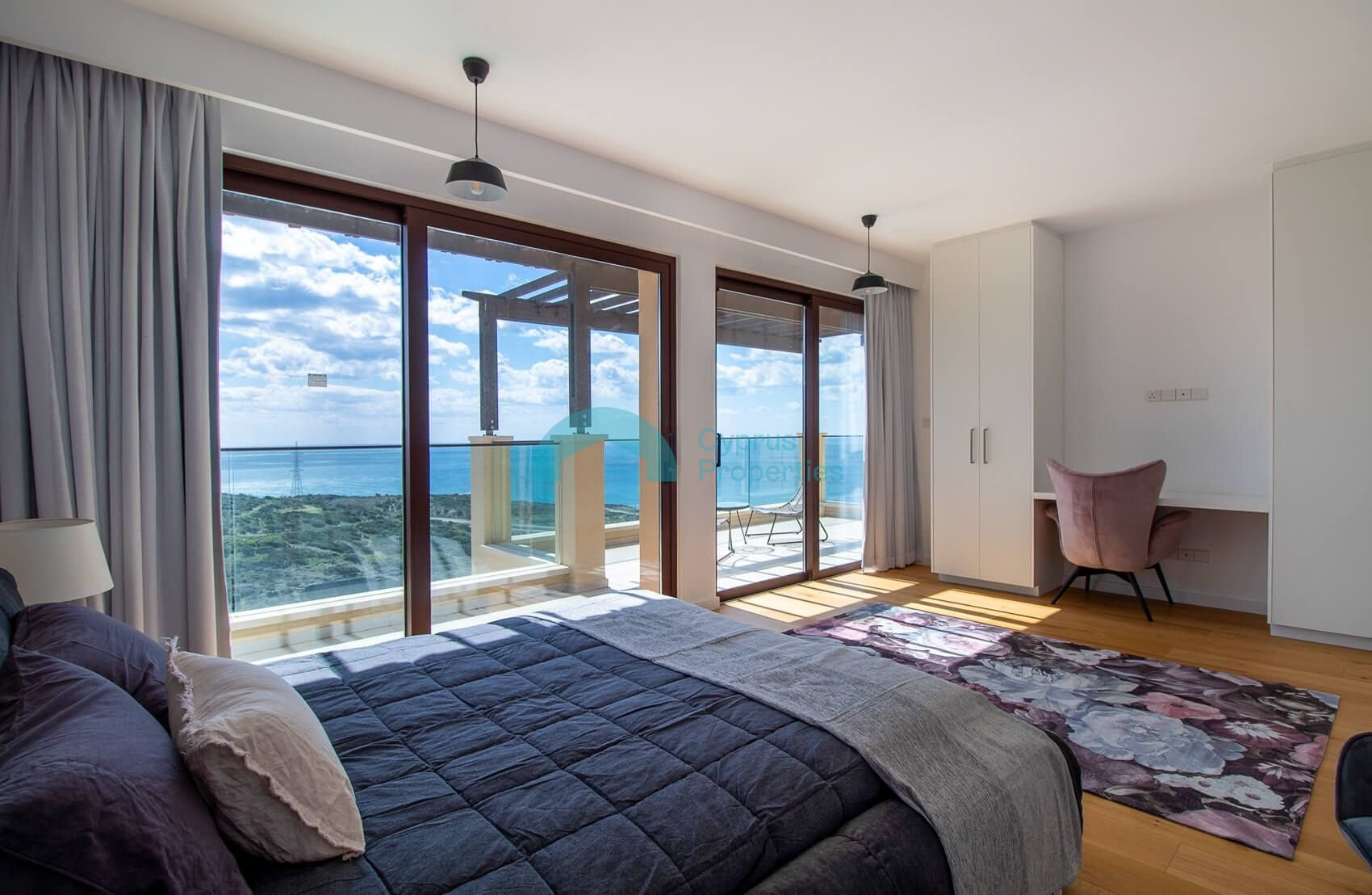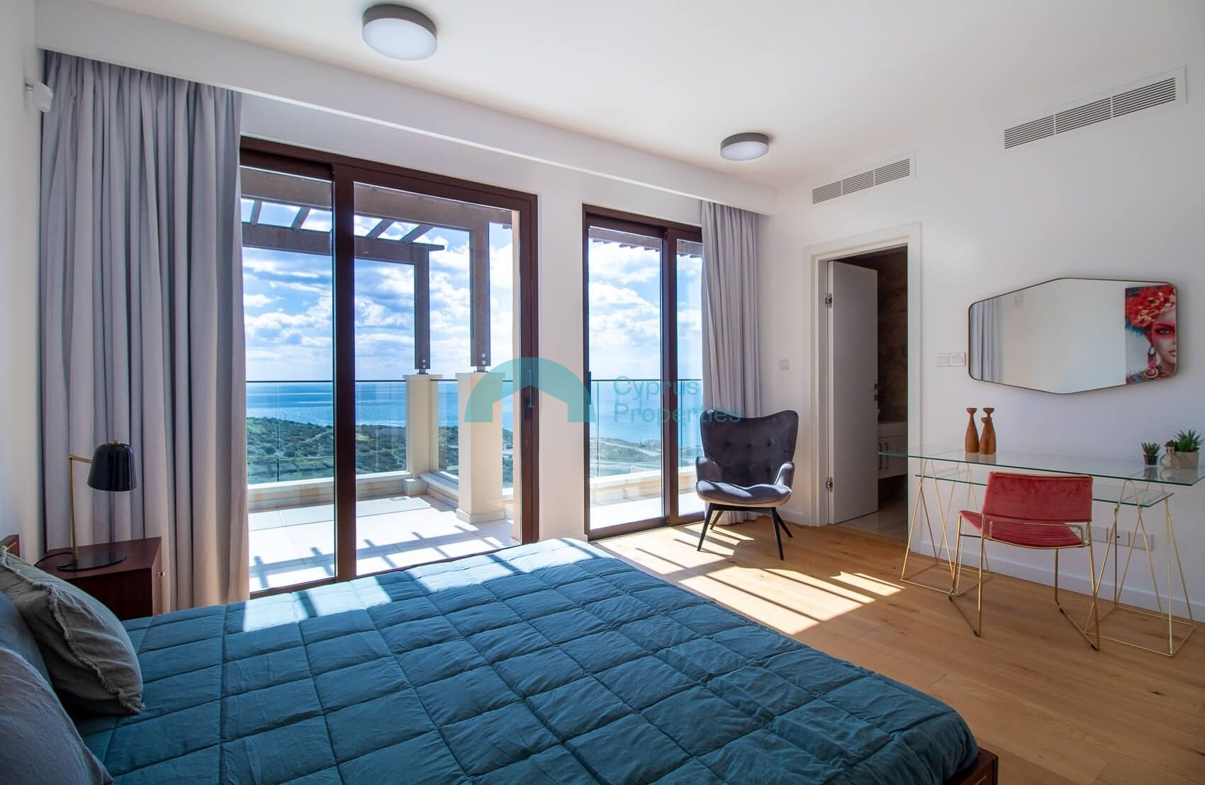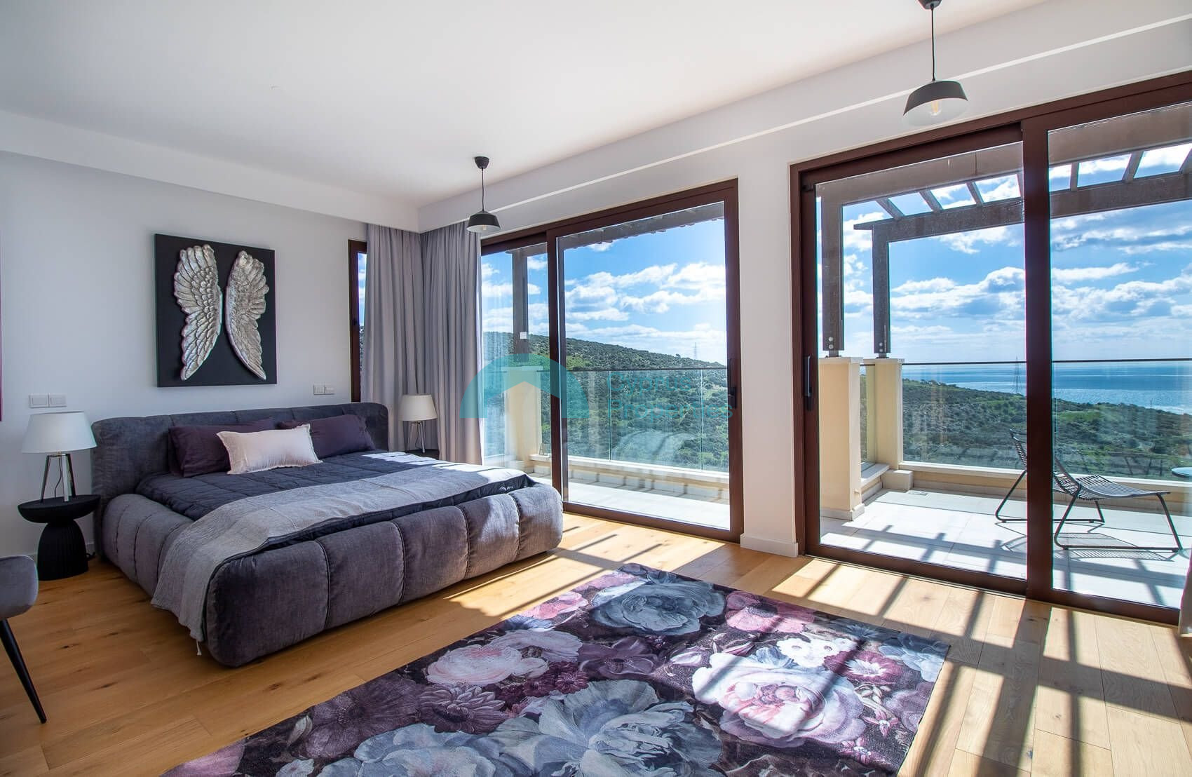 The spacious and airy first floor lobby leads to the magnificent master bedroom with panoramic glass doors opening on to a large terrace with unparalleled views of the Mediterranean and magnificent sunrise and sunset views over the horizon.