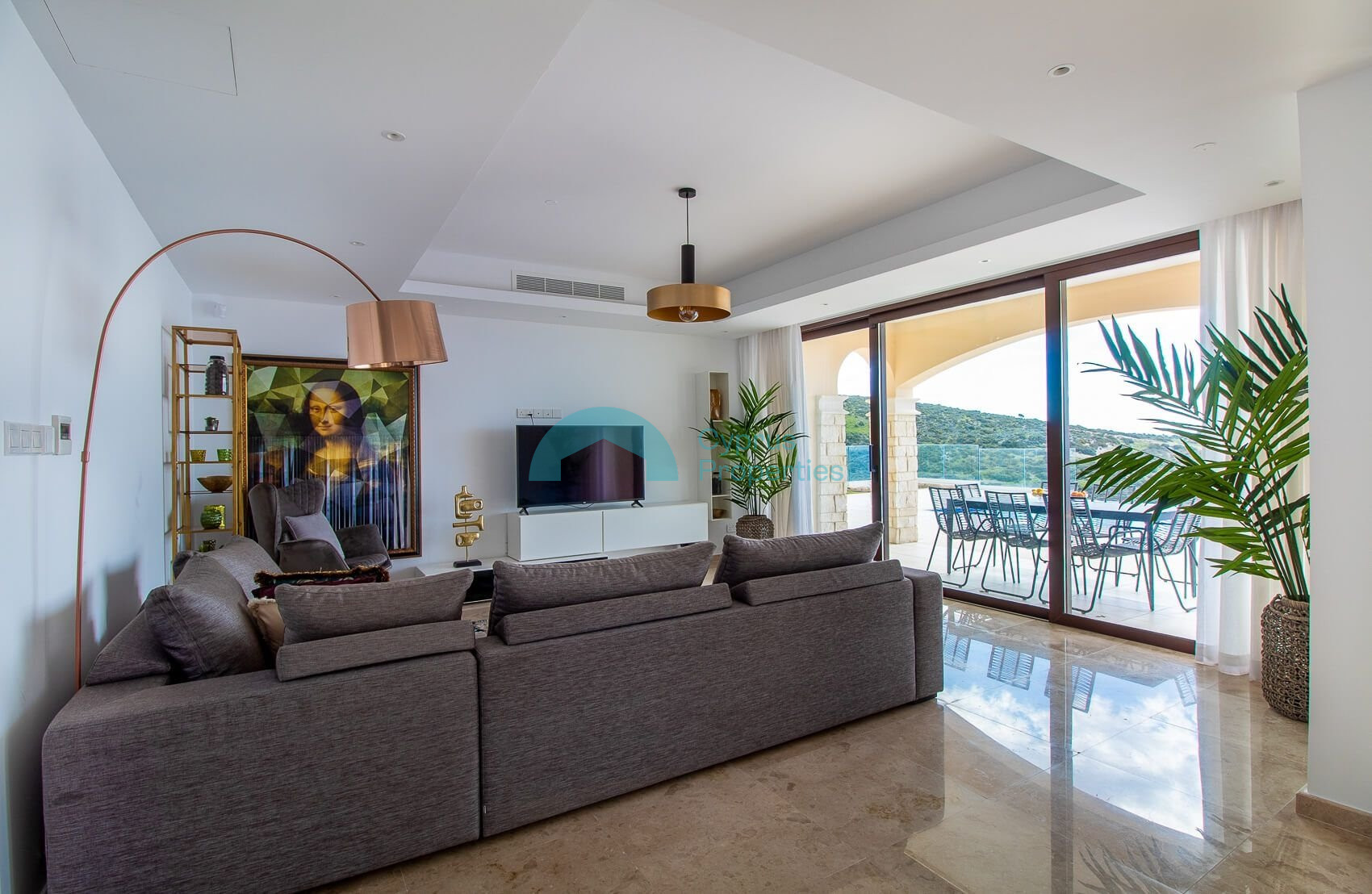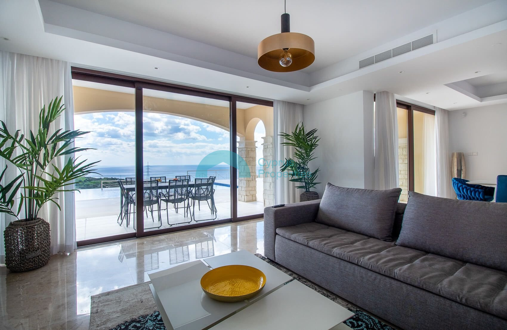Beyond this is a generously-sized sitting room with panoramic glass doors opening out on to the veranda with captivating sea views and beautifully landscaped gardens with large terraces.