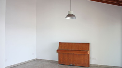 Open-plan living area with sofa bed and piano