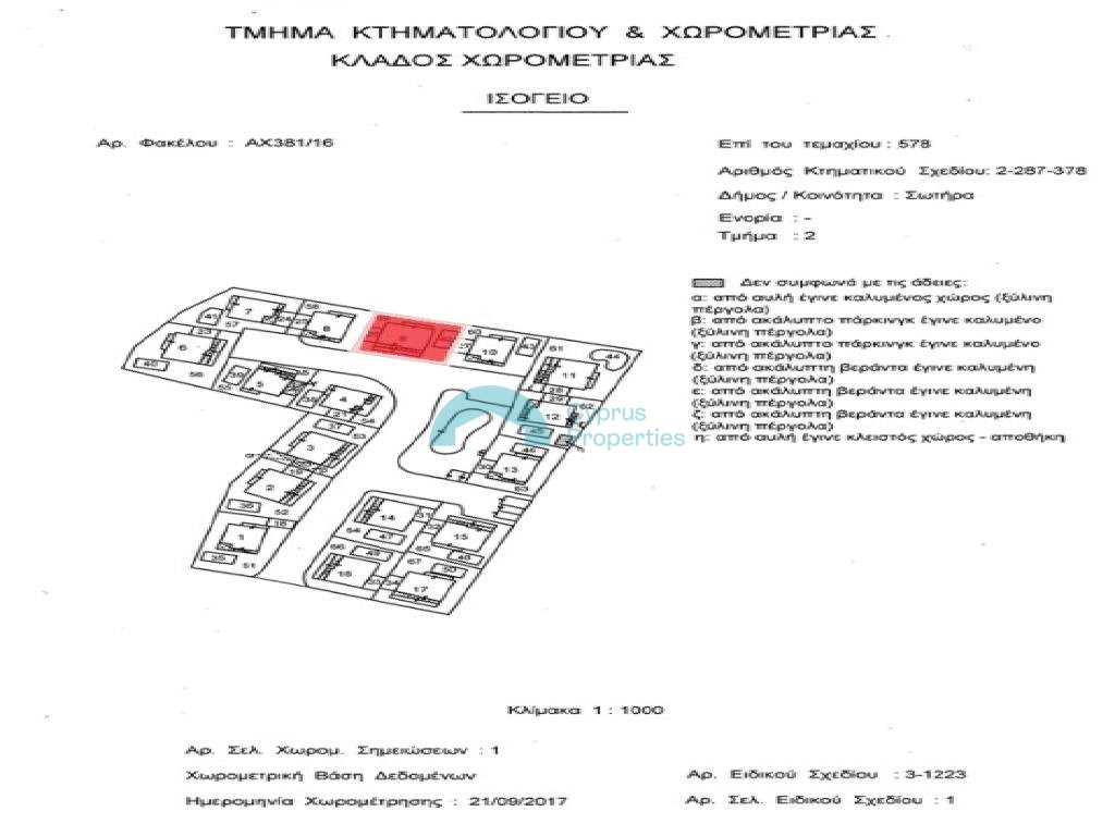 Two-story villa in the Municipality of Sotiras, approximately 500 meters north of the Sotiras Town Hall and approximately 450 meters northeast of the center of the Municipality. Two-story villa in the Municipality of Sotiras, approximately 500 meters north of the Sotiras Town Hall and approximately 450 meters northeast of the center of the Municipality. The property enjoys excellent access to neighboring municipalities. In addition, it is located close to a variety of services and amenities such as supermarkets, restaurants, bars, cafes, shops, etc. The villa with door number 24 was built around 2011 and is part of the "Sotira Limni Villas" residential complex. It consists of a living room/dining room/kitchen as an open-plan space, a guest toilet and verandas on the ground floor. On the first floor, there are three bedrooms (the master bedroom is en-suite) and a bathroom. The property has a yard, parking space and a swimming pool. The area of the internal spaces is 143 sqm (approx.), the covered verandas 11 sqm (approx.), the uncovered verandas 25 sqm (approx.) and the yard is 129 sqm. The property is vacant and is suitable for private use or for rental with a good return. Way of Transfer: Assignment of contract. The property is being sold through an assignment of a contract of sale, pursuant to which all legal rights of the seller shall be transferred to the new buyer. You are informed that there is no title deed for the subject property, and the seller cannot guarantee that a title deed will be issued in relation to the subject property. You are advised to seek independent advice in the event that the subject property will be purchased through financing, as properties without a separate title deed and/or in these circumstances, are not generally accepted by the banks as collaterals for the purpose of granting a loan. For the subject property, no information is available regarding any accruing payments relating to the contract of sales and/or the developer’s obligations to erect the property based on the approved drawings and/or permits which is a prerequisite for the issuance of a separate Title Deed. The seller does not guarantee that a title deed will and/or may be issued in relation to the subject property. The seller does not guarantee on any additional amounts that may be owed towards any person pursuant to the contract of sales and/or otherwise.