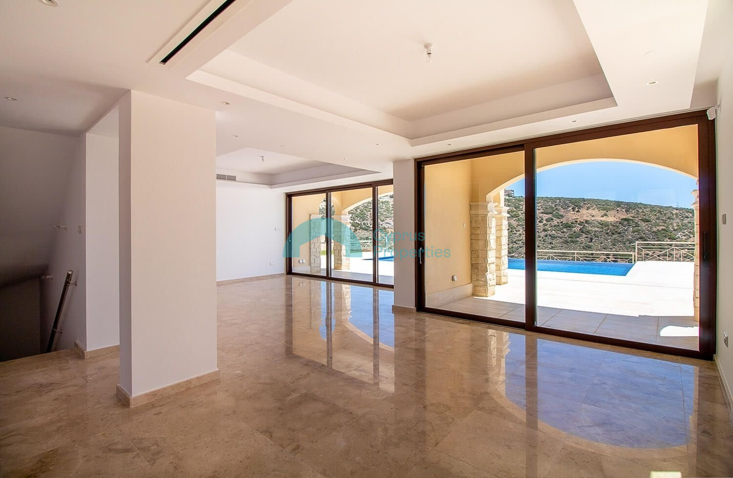 The spacious and airy first floor lobby leads to the magnificent master bedroom with panoramic glass doors opening on to a large terrace with unparalleled views of the Mediterranean and magnificent sunrise and sunset views over the horizon.
