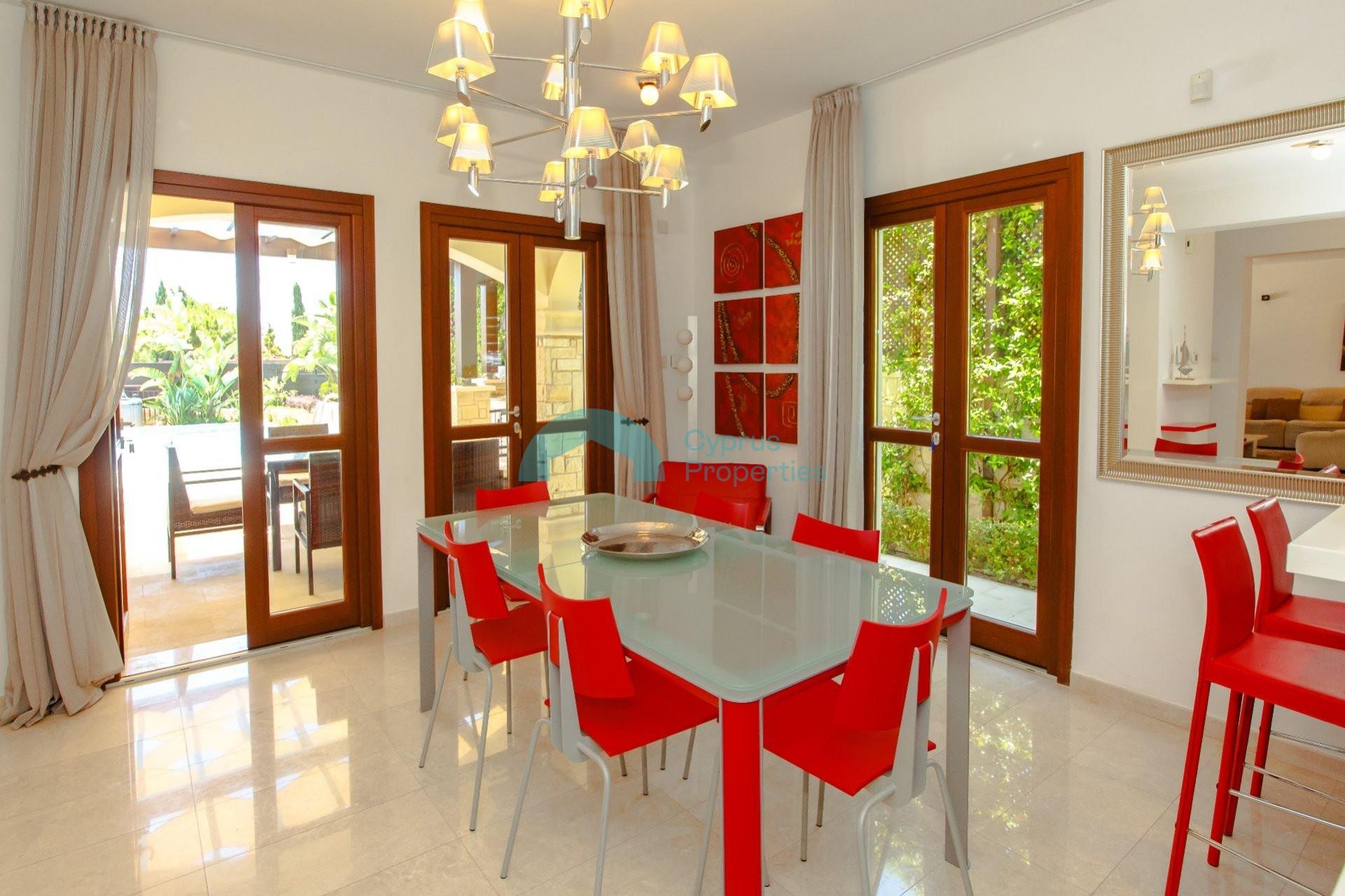 The interior of the villa is stylish and contemporary and offers light and airy open plan living areas. Attention to detail is evident everywhere with the highest quality Italian-style kitchen units, lavish marble bathrooms and marble or parquet flooring throughout. The impressive entrance opens into the spacious open plan living/dining area which features sets of French doors opening out onto the pool terrace. The lounge is beautifully finished with a plush sofa and armchair, large flat-screen TV and delightfully quirky accessories such as the designer coffee table and contrasting wall art. The adjacent dining area with modern dining table and chairs is separated from the kitchen by a handy sideboard. The kitchen is fitted with stylish high-gloss units including electric oven and hob, integrated dishwasher, washing machine and microwave. The ground floor also has a conveniently located cloakroom.