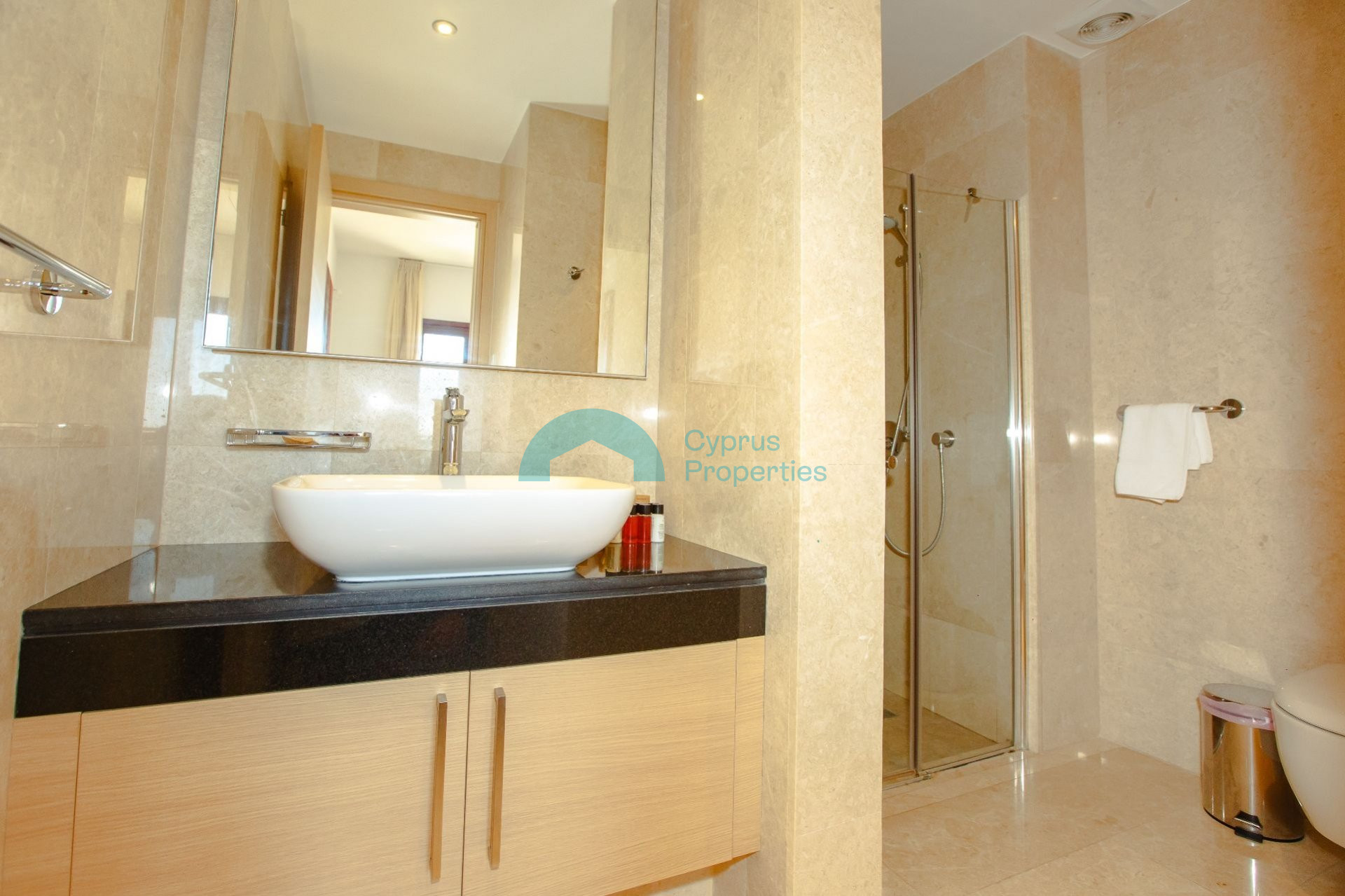 Upstairs, the spacious bedrooms are beautifully fitted with parquet floor and features attractive drapes and soft furnishings. Furnished with a king size/double beds, TV, dressers and matching side tables it offers a private balcony for each offering extensive sea views. The en-suite bathroom is fitted with twin wash basins in a marble vanity unit, and bath/shower combination.