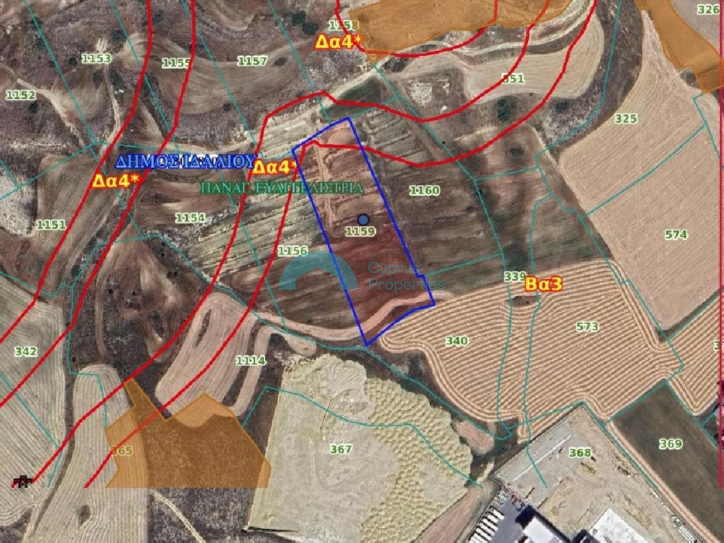 Industrial field in Panagia Evaggelistria quarter, in Dali municipality of Nicosia district. It is situated at a distance approximately 300 m west of Idalio Avenue and approximately 2.2 km east of Nicosia – Limassol - Larnaca. Industrial field in Panagia Evaggelistria quarter, in Dali municipality of Nicosia district. It is situated at a distance approximately 300 m west of Idalio Avenue and approximately 2.2 km east of Nicosia – Limassol - Larnaca. It has a regular shape with an inclined surface and it is landlocked. The property is located approximately 250 meters south of the nearest registered road. The property falls within the Industrial Zone (Category B) Ba3 (93%), having a building density of 100% and within the Protection Zone Δα4* (7%), having a building density of 10% .