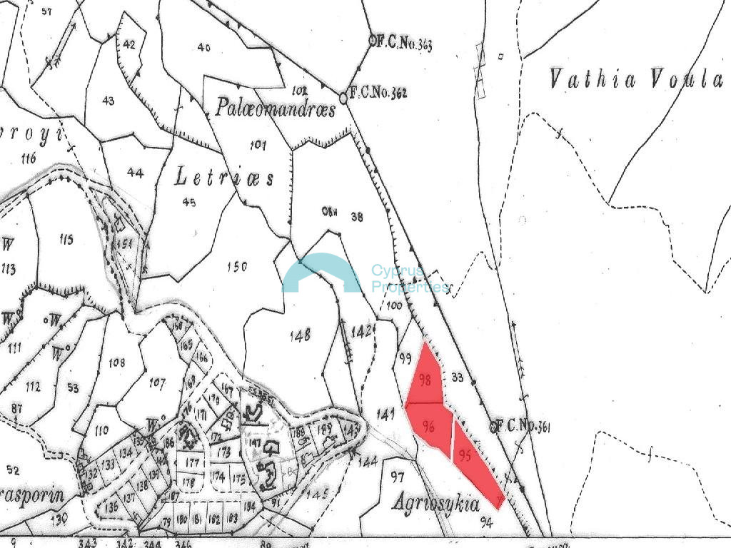The property for sale concerns 3 abutting fields, in Amargeti’s Community, in Paphos District. The property is located 280 meters northeast of the community church center and approximately 460 meters southeast of the red lake of Kinousa. The property for sale concerns 3 abutting fields, in Amargeti’s Community, in Paphos District. The property is located 280 meters northeast of the community church center and approximately 460 meters southeast of the red lake of Kinousa. As a single unit, It has an irregular shape with an inclined surface and it is landlocked. It is 20 meters northeastern of an under registered road. The properties with registration no. 0/1509 and 0/1573 fall within the Residentiall Zone H4, having a building density of 40% and the property with registration no. 0/1572 fall within the Agricultural Zone Γ3, having a building density of 10%. The properties are sold as a single unit with total area of 6.393 sqm. The asset does not qualify for the 50% reduction of property transfer fees imposed or levied by the Department of Lands and Surveys (Fees and Charges) Law (Cap.219). The asset does not qualify for the 50% reduction of property transfer fees imposed or levied by the Department of Lands and Surveys (Fees and Charges) Law (Cap.219).