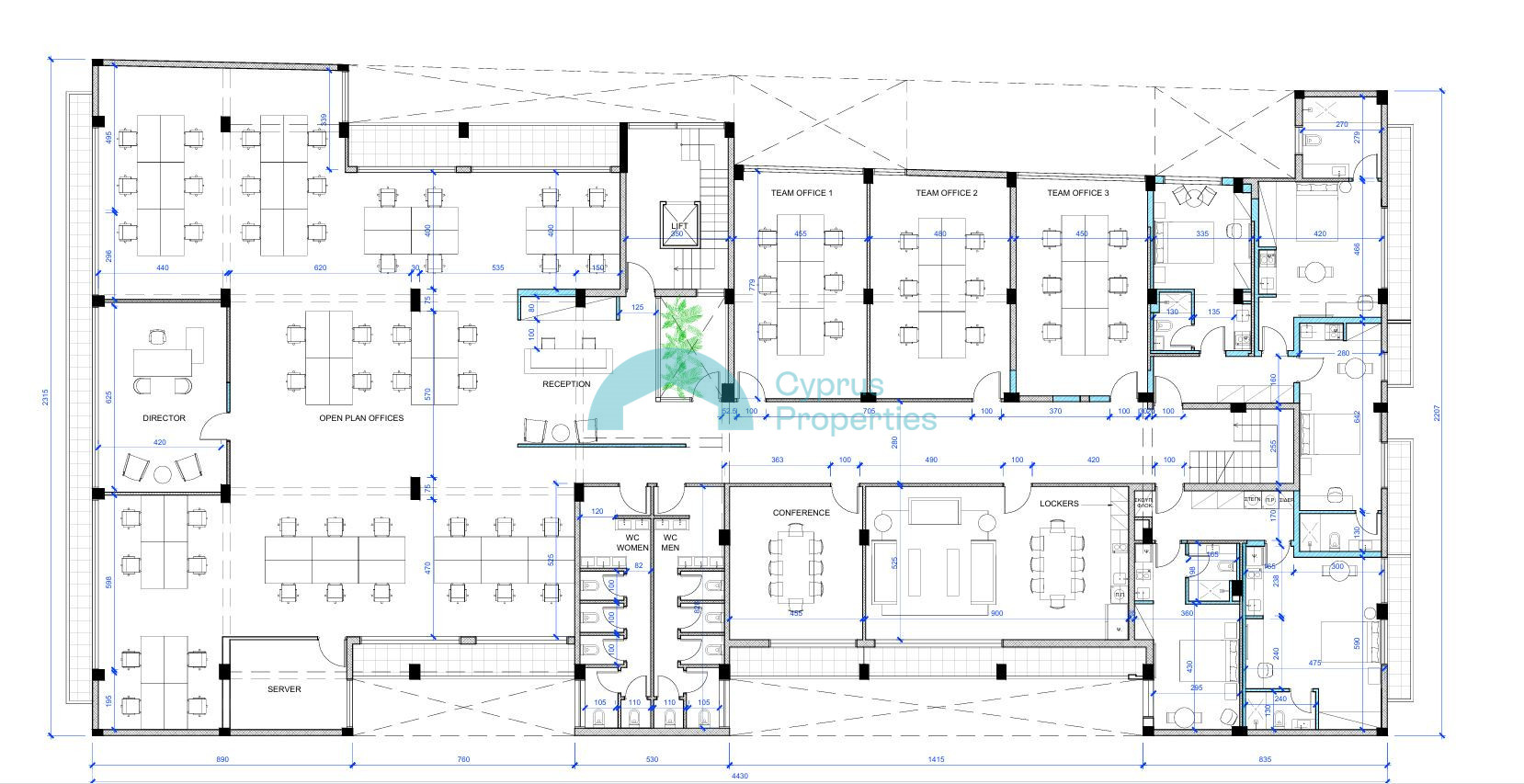 The main office area features bright open-plan workspaces, private offices, meeting rooms, and modern facilities designed for productivity and comfort.
