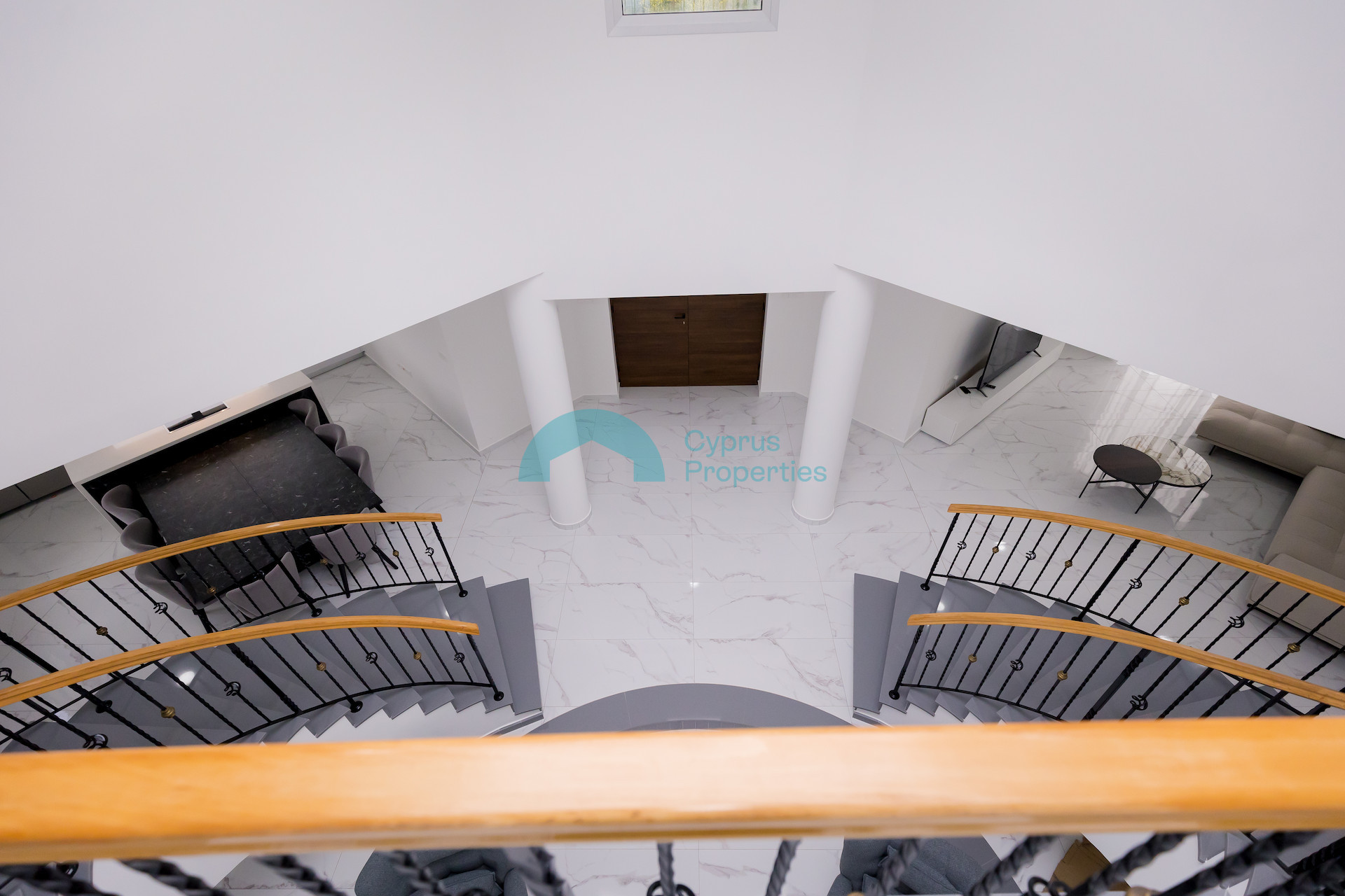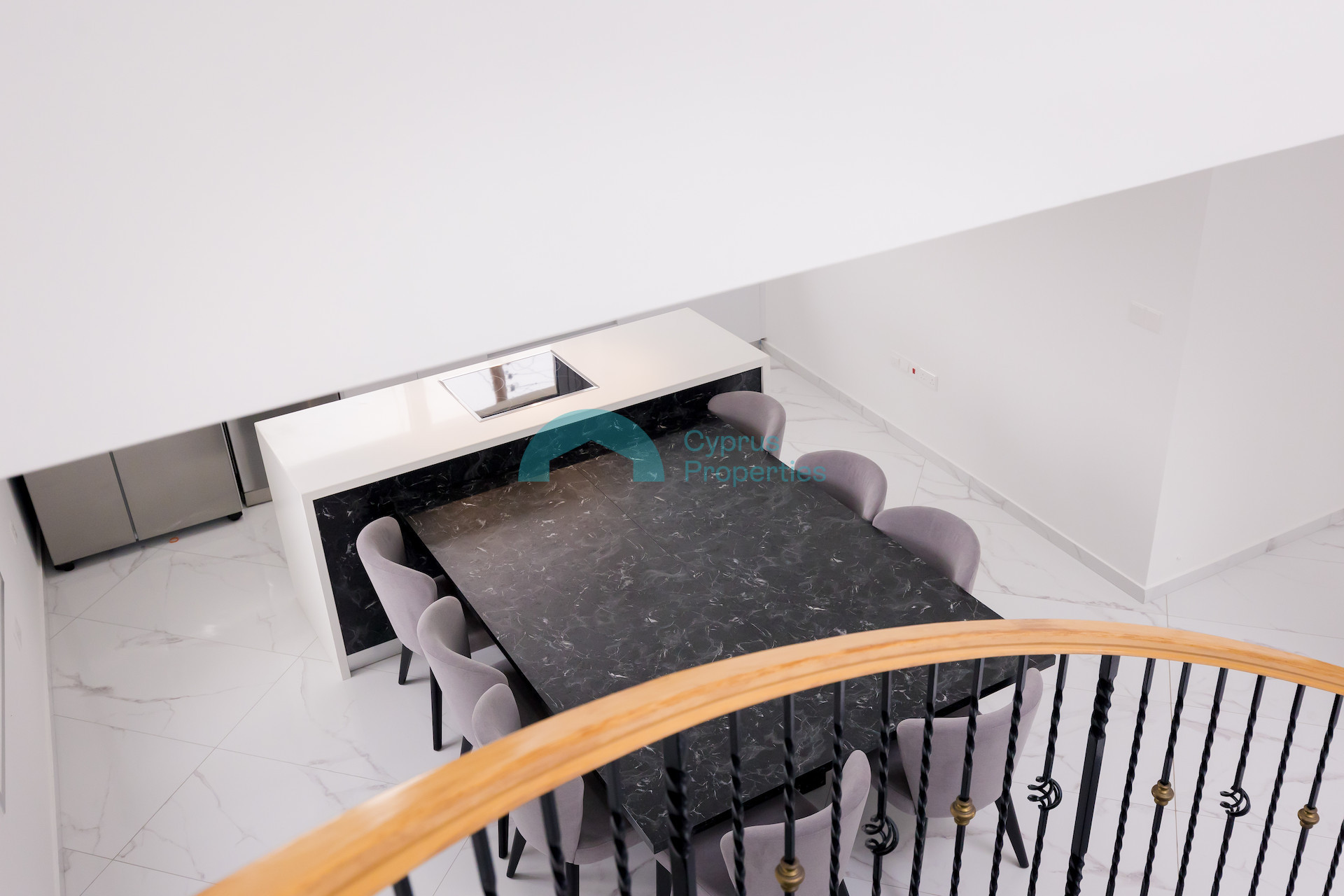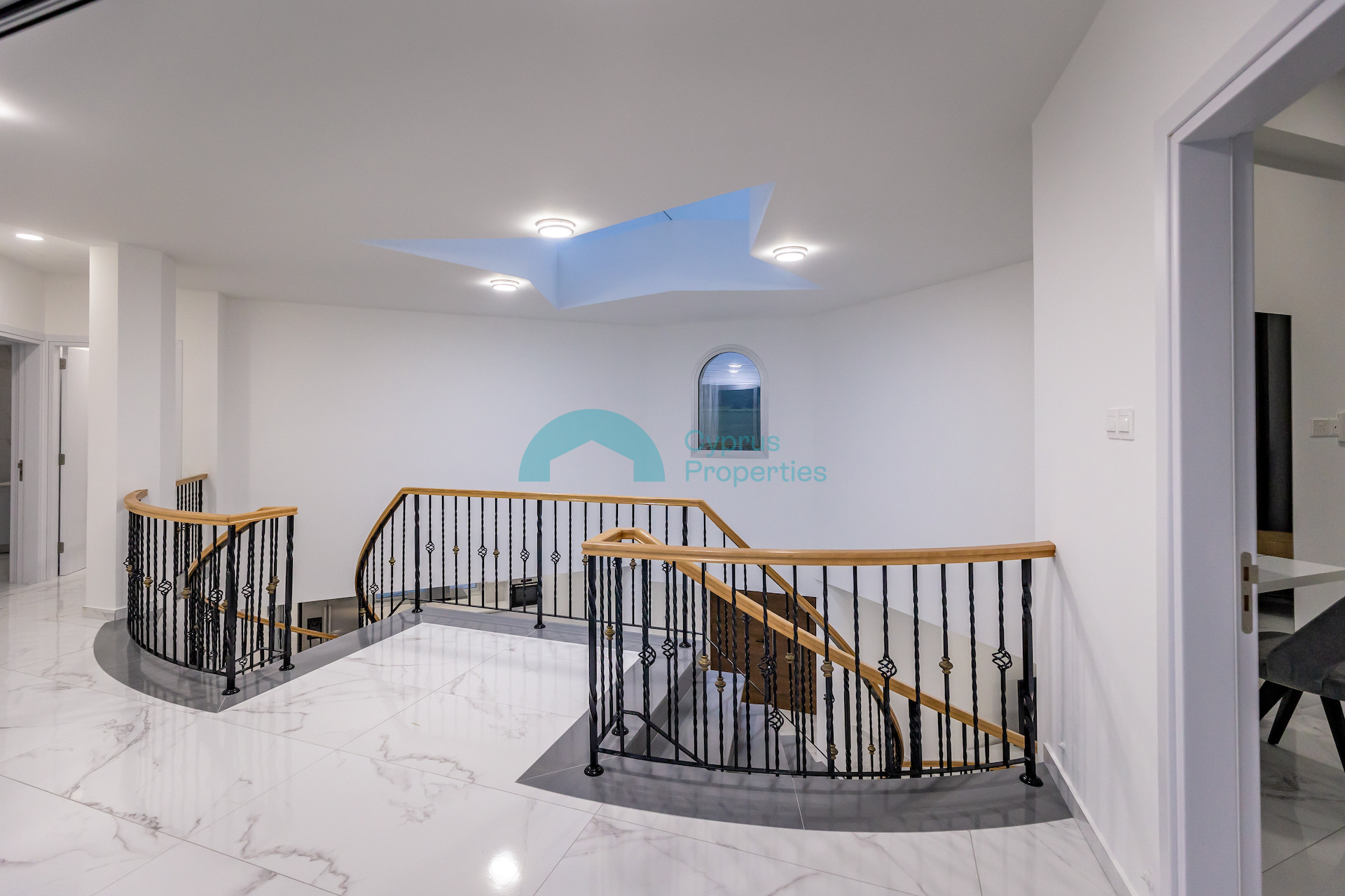 The villa’s striking architectural design seamlessly blends elegance with functionality. The ground floor comprises a spacious living room, dining area, and fully equipped kitchen, all centred around a stunning atrium with a skylight that fills the home with natural light.