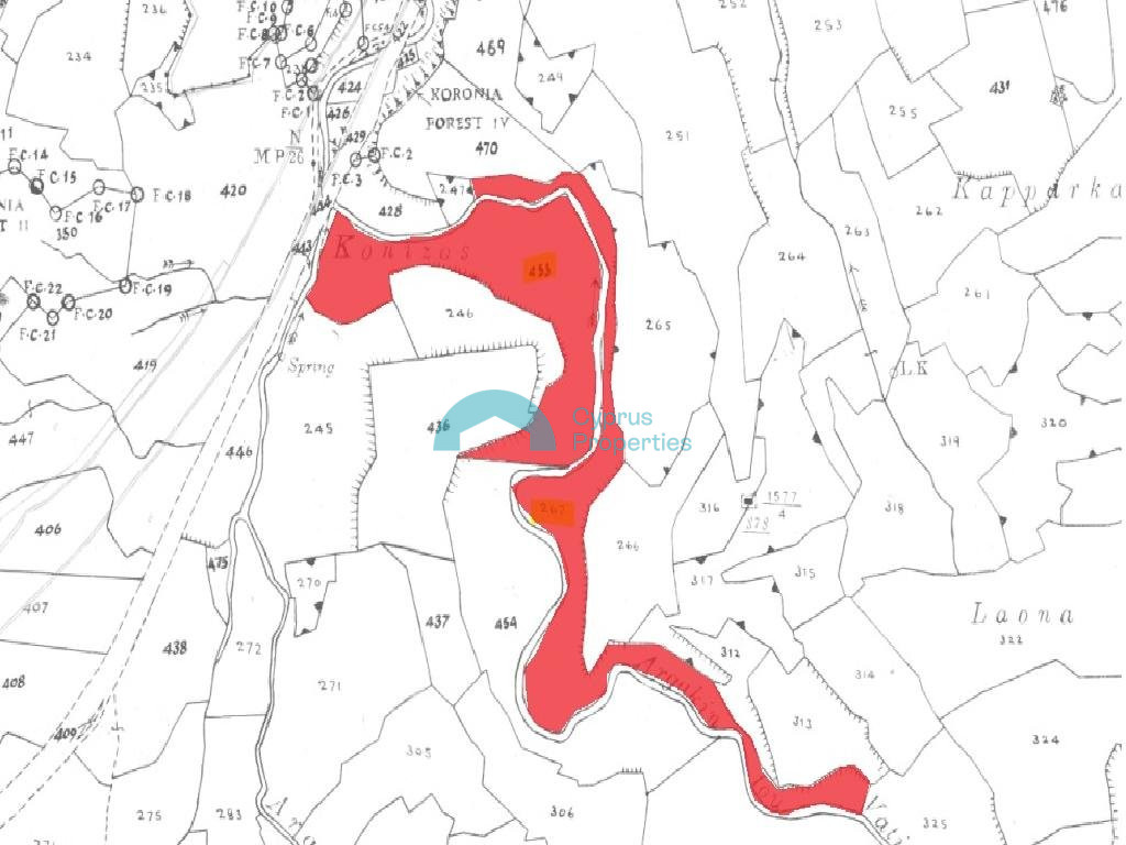 The property for sale concerns 2 agricultural fields, in Kato Koutrafas community of Nicosia district. It is situated at a distance approximately 1.6 km southwest of the community center and approximately 20 m east from Troodos - Nicosia road connection. The property for sale concerns 2 agricultural fields, in Kato Koutrafas community of Nicosia district. It is situated at a distance approximately 1.6 km southwest of the community center and approximately 20 m east from Troodos - Nicosia road connection. As a single unit, It has an irregular shape and an inclined surface. It abuts onto a public registered road along its northwestern boundary with frontage of approximately 37 meters. The properties fall within the Agricultural Zone Γ3, having a building density of 10%. It has to be noted that within the property there are high voltage cables passing through the field. The properties are sold as a single unit with total area of 38.415 sqm. The asset does not qualify for the 50% reduction of property transfer fees imposed or levied by the Department of Lands and Surveys (Fees and Charges) Law (Cap.219). The asset does not qualify for the 50% reduction of property transfer fees imposed or levied by the Department of Lands and Surveys (Fees and Charges) Law (Cap.219).