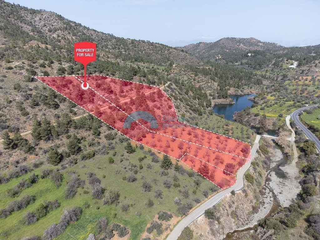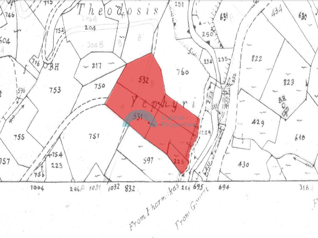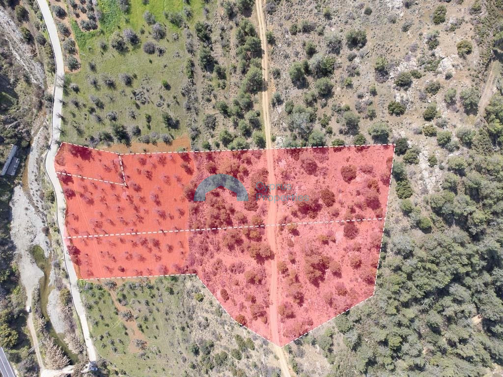 The property for sale concerns 3 agricultural abutting fields, in Gourri community of Nicosia district. It is situated at a distance approximately 2.5 km northwest of the community center and approximately 65 m west from Gourri – Kalo Chorio (Oreinis) road connection. The property for sale concerns 3 agricultural abutting fields, in Gourri community of Nicosia district. It is situated at a distance approximately 2.5 km northwest of the community center and approximately 65 m west from Gourri – Kalo Chorio (Oreinis) road connection. As a single unit, It has an irregular shape and an inclined surface. It abuts onto a public registered road along its eastern, southwestern and western boundary with total frontage of approximately 102 meters. The properties fall within the Agricultural Zone Γ3, having a building density of 10%. It is worth noting that the property is affected by a registered road in its western part which divides the property into two new lots. The properties are sold as a single unit with total area of 14.234 sqm.