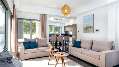 Situated two minutes walk from Pervolia Blue Flag Beach and a mere three minute walk away from the historic old Faro lighthouse and the rural authentic coastline with its clear, naturally energizing waters. Five minutes away from the centre of Pervolia village with its traditional style cafes, restaurants and bars, Larnaca International Airport is conveniently situated 10 minutes away and15 minutes away from Larnaca City centre.
